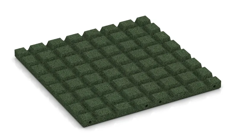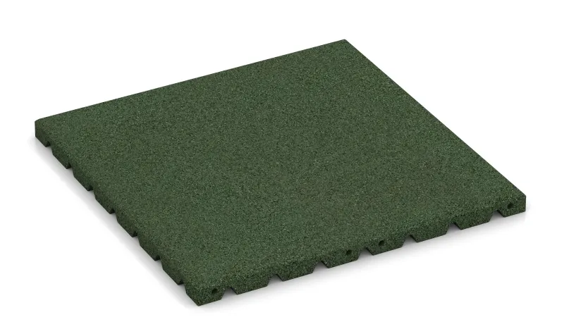 Les dalles sont fabriquées en granulats de caoutchouc liés au PU, avec une surface antidérapante et résiliente. L’épaisseur et la densité déterminent l’absorption des chocs et la hauteur de chute certifiée selon EN 1177. Le format 50 × 50 cm réduit les découpes et permet de remplacer facilement les dalles individuelles si nécessaire.
