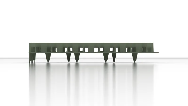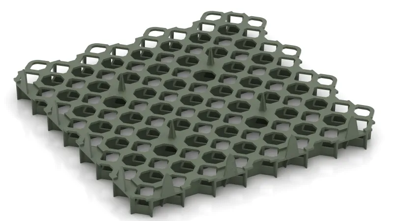 Aan de onderzijde bevinden zich ca. 4 cm lange grondpennen die de plaat stevig verankeren. Zijdelingse vergrendelingen klikken in elkaar en vormen een duurzaam stabiel grid. Gevuld met grind is het systeem bestand tegen belastingen tot 400 t/m².