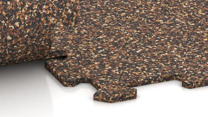 Les dalles sont fabriquées à partir de blocs surdimensionnés de granulats de caoutchouc ELT liés au PU. Après une phase de maturation et de refroidissement, ces blocs sont fendus en deux. Le résultat est des dalles de fitness particulièrement fines avec une surface en caoutchouc typique, qui apparaît presque fermée et empêche la pénétration de saletés et d’humidité.