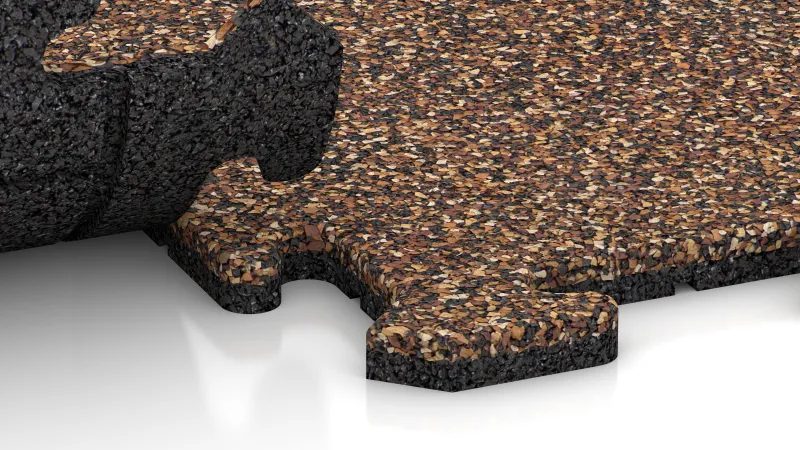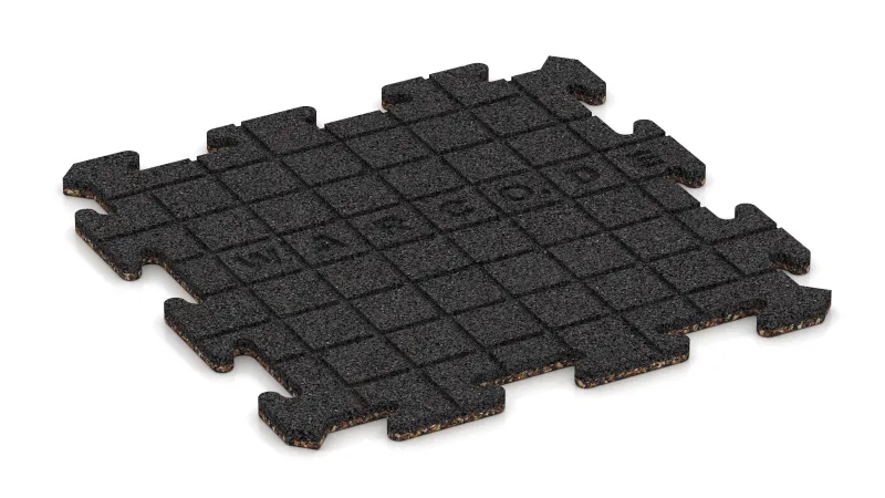 Die Platten sind in den Formaten 50 × 50 cm und 100 × 100 cm erhältlich. Beide Varianten besitzen eine Puzzle‑Verzahnung mit abgerundeter Fase, die beim Pressen der Platten maßhaltig ausgeformt wird. Dadurch entsteht eine belastbare Verbindung und ein optisch sauberes Fugenbild. Das Format 50 × 50 cm eignet sich für Innenflächen und kleine Außenbereiche (z. B. vor dem Basketballkorb) bis etwa 30 m². Das großformatige 100 × 100 cm sollte ausschließlich im Innenbereich oder auf überdachten Flächen – etwa in Sporthallen, Zelten oder Gewerbebereichen – verwendet werden. Beide Formate sind zudem für temporäre bzw. mobile Einsätze geeignet, z. B. bei Veranstaltungen.