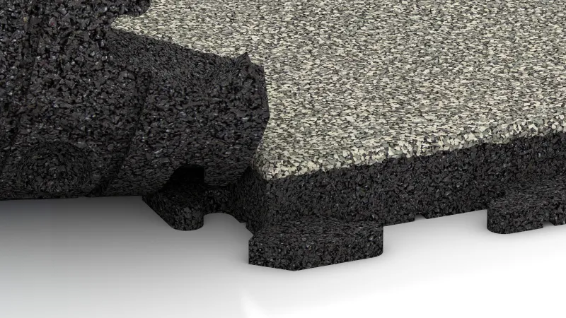 Comfort & veiligheid. Het oppervlak is slipvast en biedt zekerheid bij droog en nat weer. De elastische structuur dempt loopgeluiden en stoten, waardoor de vloer comfortabel en gewrichtsvriendelijk aanvoelt.