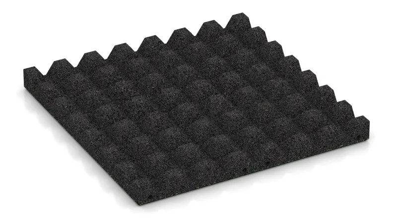 De tegels zijn gemaakt van PU-gebonden rubbergranulaat met een veerkrachtig, slipvast oppervlak. Dikte en dichtheid bepalen de schokabsorptie en de gecertificeerde valhoogte volgens EN 1177. Het 50 × 50 cm raster minimaliseert snijverlies, en losse tegels kunnen eenvoudig worden vervangen.