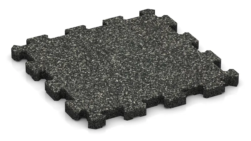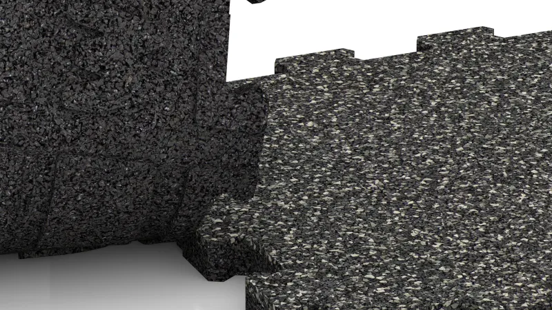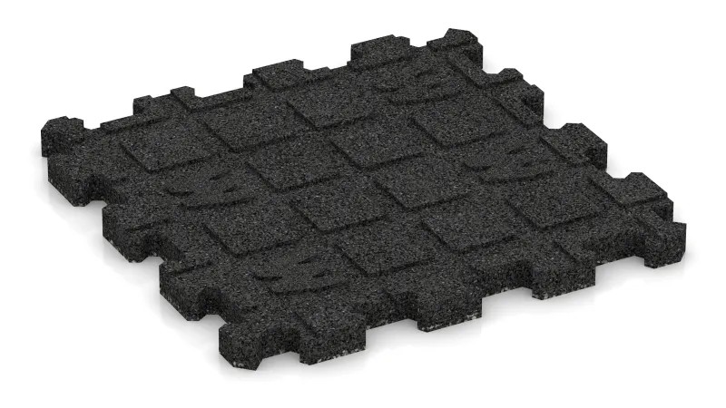 Elke tegel bestaat uit twee lagen. De toplaag van door‑en‑door gekleurd, schadstofvrij EPDM‑rubbergranulaat is bestand tegen chloor en UV‑straling en behoudt zijn kleur langdurig. De onderlaag van zwart ELT‑rubbergranulaat, afkomstig van gerecyclede autobanden, zorgt voor elasticiteit, stabiliteit en schokabsorptie.